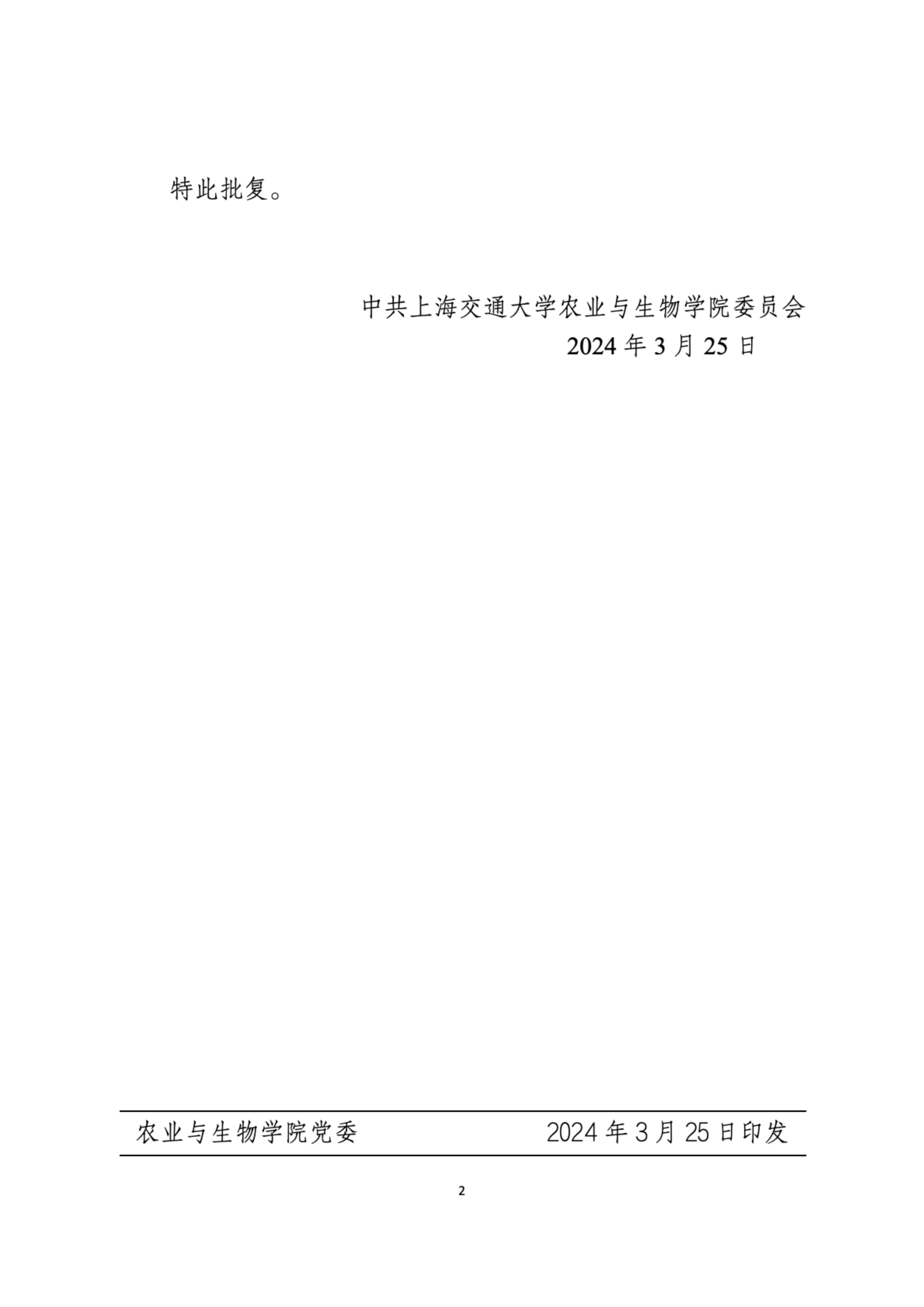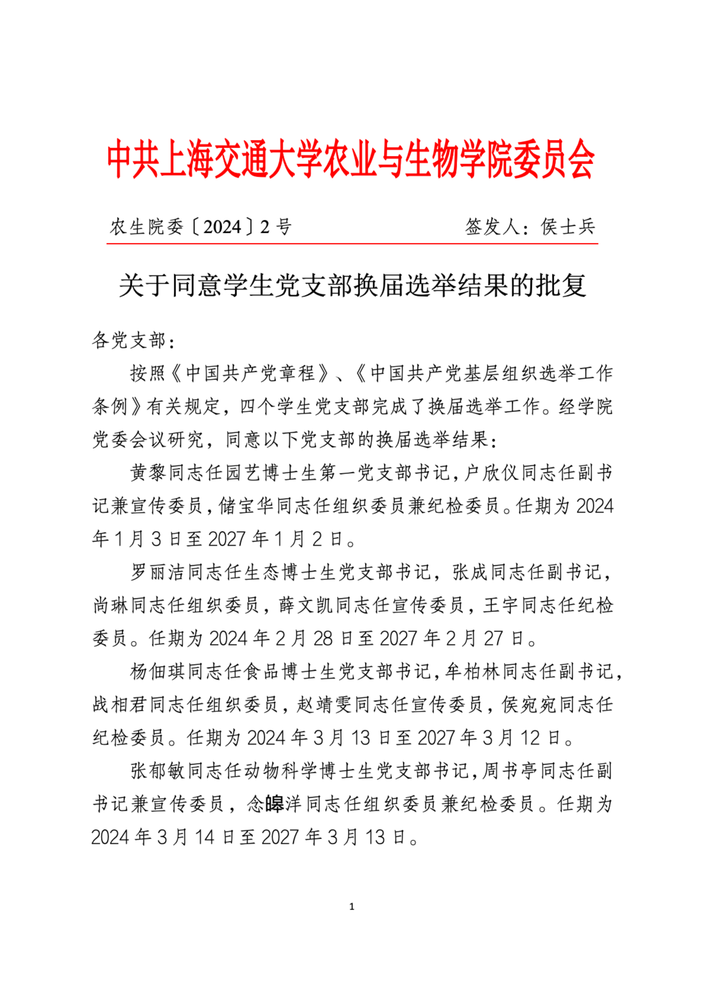 农生院委〔2024〕2号 关于同意学生党支部换届选举结果的批复