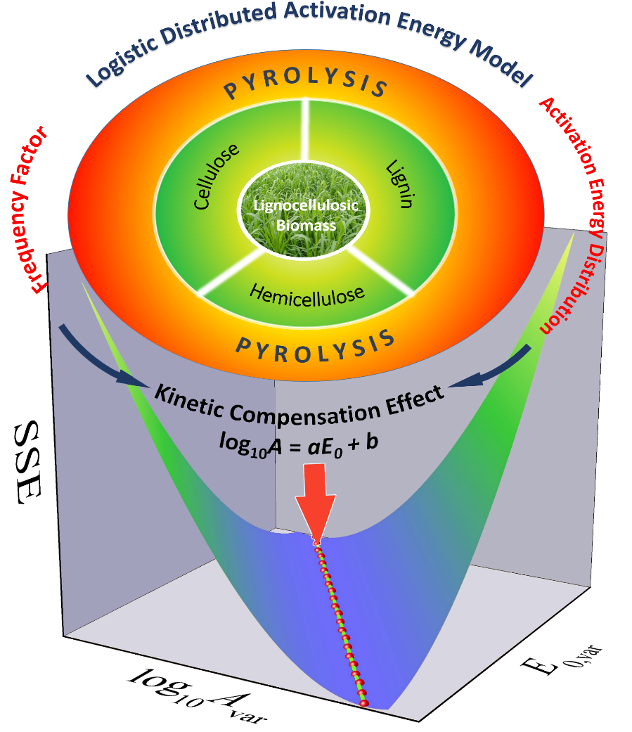 论文采用误差平方和曲面图工具(SSE Surface Tool)和模式搜索算法(Pattern Search Algorithm)分析了理论模拟数据和纤维素热解动力学实验数据,研究生物质组分(纤维素,半纤维素和木质素)热解的动力学频率因子与Logistic活化能分布之间的关系,结果发现存在多组模型参数集可非常好地描述热解动力学曲线,而且这些参数集中频率因子的对数与活化能分布平均值之间存在完美的线性关系(即动力学补偿效应)。论文的研究结果有助于生物质热解动力学机理的解析以及生物质热解过程的计算流体力学(CFD)仿真和过程模拟。论文中建立的分析方法对其他固态反应体系的动力学研究也有着重要的借鉴意义。
