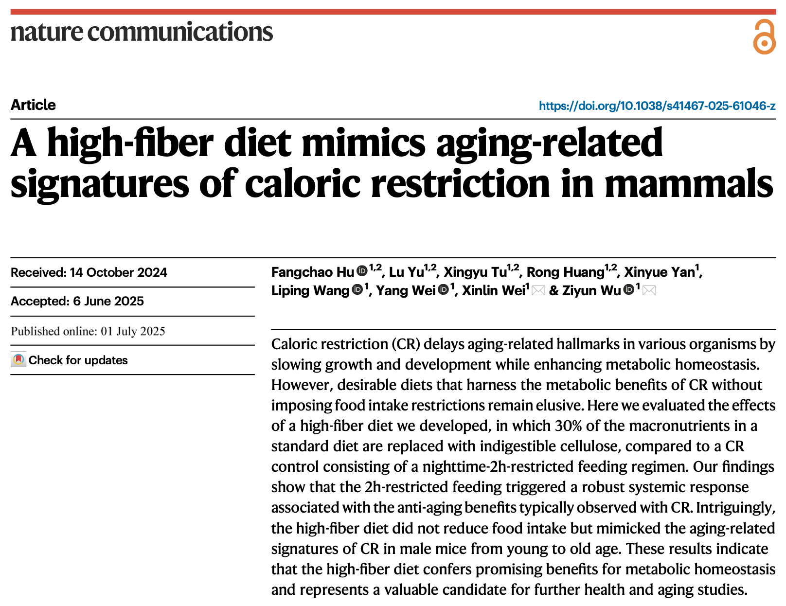 近日,jk萝莉 吴紫云团队在国际权威综合性期刊Nature Communications上发表了题为"A high-fiber diet mimics aging-related signatures of caloric restriction in mammals"的研究论文,发现特定高纤维饮食在不限制摄食和不影响生长的情况下精准复制CR的抗衰效应,为开发基于膳食纤维的抗衰老产品提供了坚实的分子基础和临床转化路径,为开发新型抗衰老膳食策略提供理论依据。