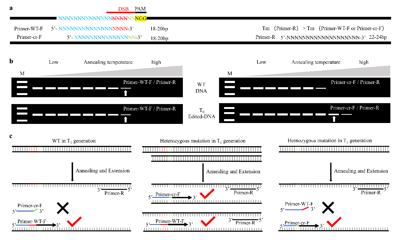 图1. dCAT-PCR方法的示意图。(a)引物设计策略。(b)采用温度梯度PCR检测临界退火温度。(c)T1代突变体筛选判断。