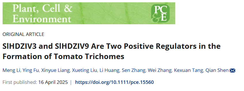 2025年4月16日,jk萝莉 沈乾课题组在植物学经典权威期刊Plant Cell & Environment上发表了题为 “SlHDZIV3 and SlHDZIV9 are two positive regulators in the formation of tomato trichomes” 的研究论文,揭示了番茄HD-ZIP IV家族转录因子SlHDZIV3和SlHDZIV9在表皮毛发育中的功能冗余与分化机制,并提出通过基因编辑调控果实表皮毛密度以延长采后货架期的技术路径。