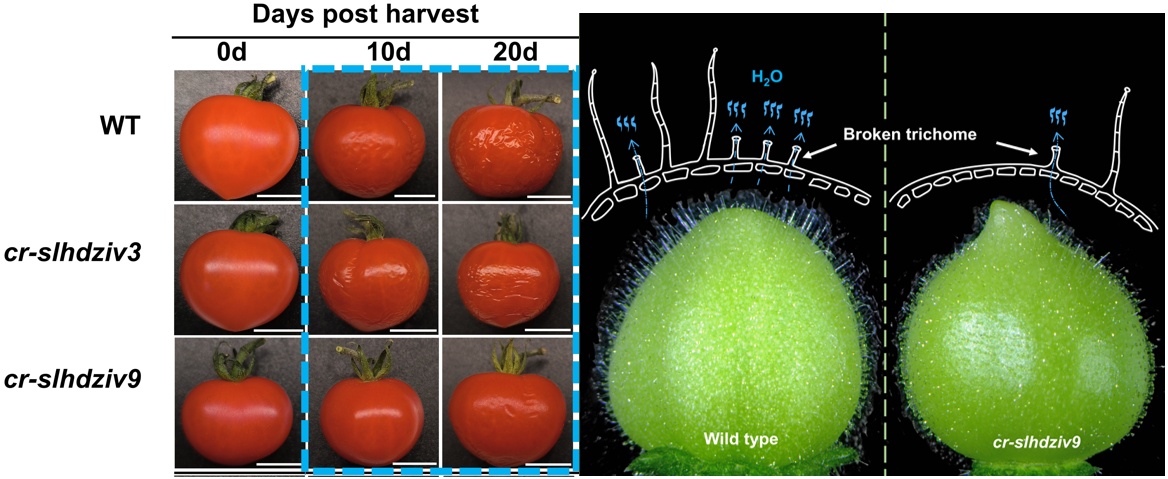 本研究中我们发现,番茄果实表皮毛缺乏多细胞基座,在采收或运输中易受损脱落,从而暴露孔隙破坏角质层完整性,加速水分流失。当基因编辑敲除SlHDZIV9基因后,突变体cr-slhdziv9的果实表皮毛密度更低,因此该突变体果实在采摘、储存、运输等过程中因果实毛受损而暴露的孔隙数量更少,从而保护了角质层的完整性,降低了采后失水率,延长了货架期。该结果证实了通过调控果实毛密度以延长采后货架期的策略的可行性,为番茄抗逆育种和采后品质改良提供了理论依据与技术路径。