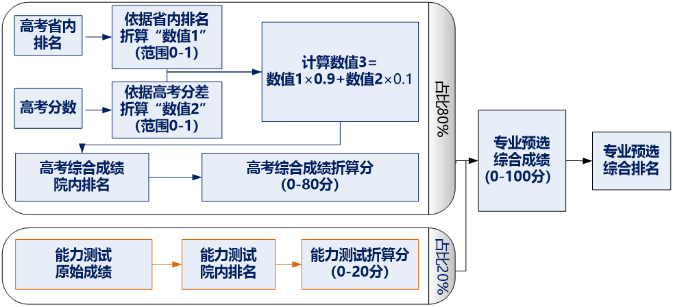 专业分流综合成绩=高考综合成绩折算分+能力测试成绩折算分