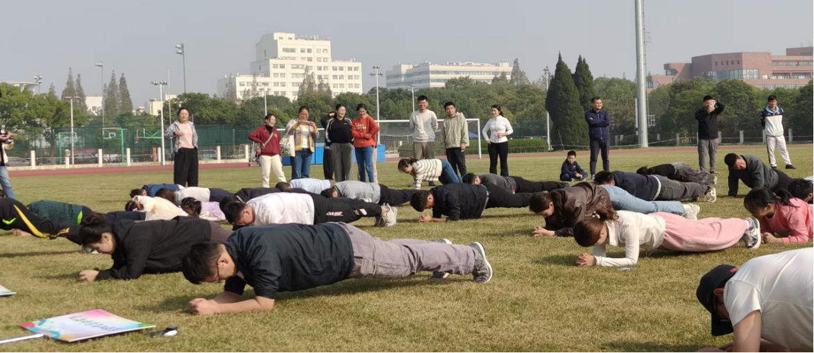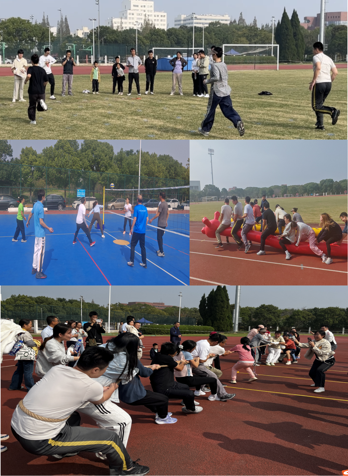 随着广播体操音乐响起,全场教职工整齐划一的动作瞬间点燃了运动热情。紧接而来的是平板支撑项目。“计时开始!”一声令下,参赛教职工人员做出来标准平板支撑姿势。大家咬牙坚持,完成意志的磨炼,也挑战自己的极限。其后气排球及各种团体趣味项目陆续开展。翻纸牌接力中,各队团结协作,战术与默契并重,比分紧咬不放。气排球比赛现场欢声笑语,大家沉浸在比赛的乐趣与激情之中。多足虫项目更是趣味盎然,大家喊着“一二、一二”的节拍,在节奏与默契中感受着团体运动的欢乐与魅力。拔河比赛将比赛氛围推向高潮。各队老师戴上手套整装上阵谋划战略。一声哨响,绳索瞬间绷直,选手们嘶声呐喊,观众们挥臂加油,队伍之间展开了激烈的拉锯,拔河比赛将气氛推向白热化,助威声与欢呼声响彻全场。