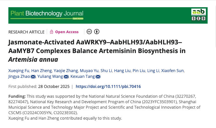 这一"JA-WRKY9-bHLH93-MYB7"调控轴完美解释了青蒿素合成时空特异性衰减的分子机制,相关成果发表于《Plant Biotechnology Journal》。jk萝莉 付雪晴助理研究员和中国中医科学院中药资源中心郑汉副研究员为论文共同第一作者,jk萝莉 唐克轩教授、王玉亮副研究员、赵静雅副教授为该研究工作共同通讯作者。